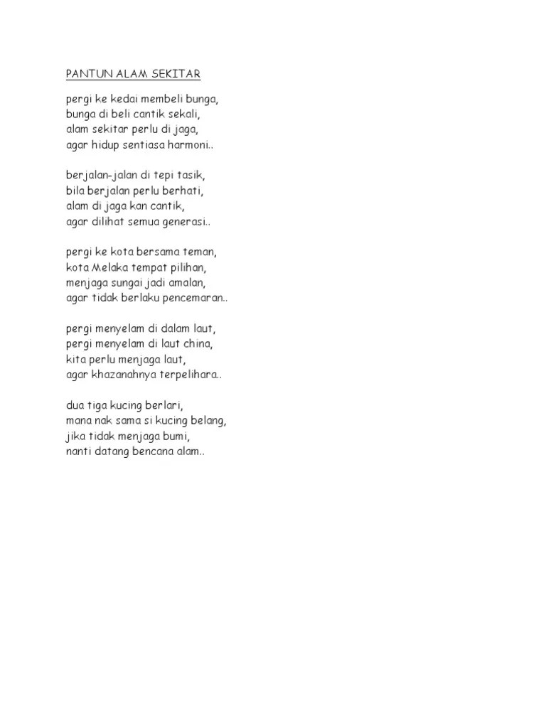 Sajak Alam Sekitar Sekolah Menengah : Hebahan Pertandingan Menulis Jabatan Alam Sekitar Facebook. Antologi tingkatan 1, 2, 3 (cerpen, sajak, pantun, syair, drama, prosa. Kandungan ini merangkumi kajian tentang interaksi manusia dengan alam sekitar fizikal dan alam sekitar manusia.